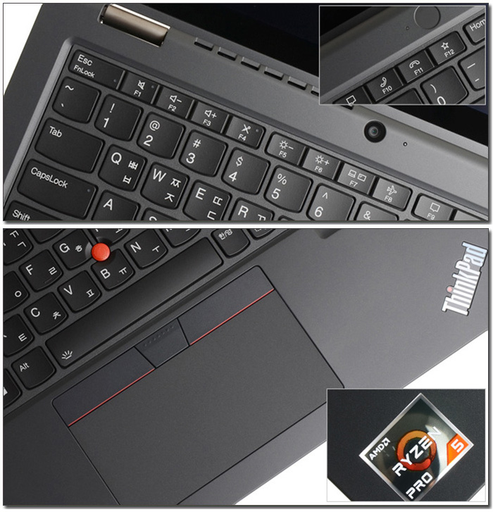 키보드 1열에 밝기 및 볼륨, 컨퍼런스 콜 등 다양한 편의기능을 제공하며 상단에는 5MP 카메라와 통풍구, 전원 버튼이 설치된 것을 확인할 수 있다. 특히 높은 보안성을 요구하는 비즈니스 노트북 답게 전원버튼에 지문인식 센서가 장착되어 편하게 로그인을 할 수 있다.