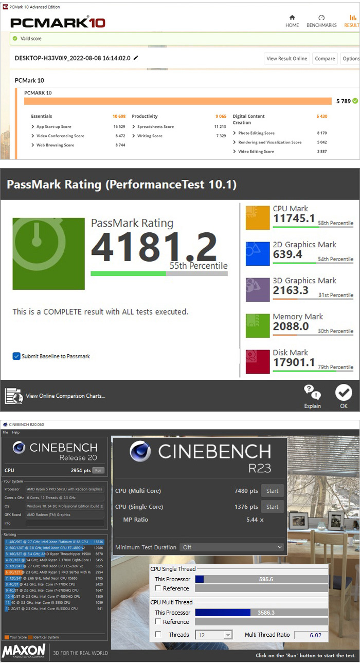 벤치마크 프로그램을 이용해 기기의 성능을 확인하고 있는 모습으로 웹서핑이나 멀티테스킹은 물론 무거운 업무용 S/W도 부드럽게 실행할 수 있는 스코어를 보여주었다. 업무용이나 학습용 노트북으로는 부드럽게 사용할 수 있을 것이다.