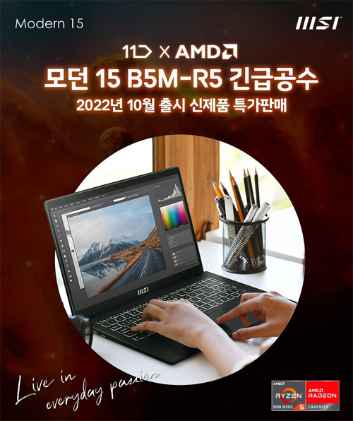 이번 긴급공수 행사는 2022년 10월 7일(금) 14시부터 24시까지 진행되며, MSI '모던 15 B5M-R5' 노트북을 긴급공수 할인 특가에 7%(최대 7만원) 중복 할인쿠폰 및 AMD 3만원 장바구니 쿠폰, 5% 카드 할인 등 트리플 할인이 적용된 599,000원에 구매 가능하다.
