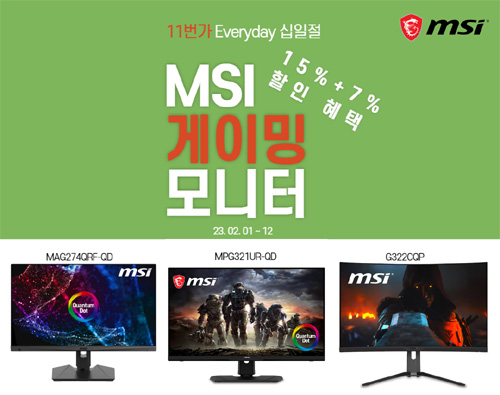 MSI는 국내 유명 E커머스 11번가에서 진행하는 ‘Everyday 십일절’을 통해 인기 게이밍 모니터 할인 행사를 열었다. 다가오는 신학기를 맞이하여 열린 11번가 ‘Everyday 십일절’ 행사는 2023년 2월 1일부터 12일까지 총 12일간 진행되며, 누구나 사용 가능한 15% 중복쿠폰과 함께 7% 카드할일을 더해 최대 22%의 할인혜택을 제공한다.