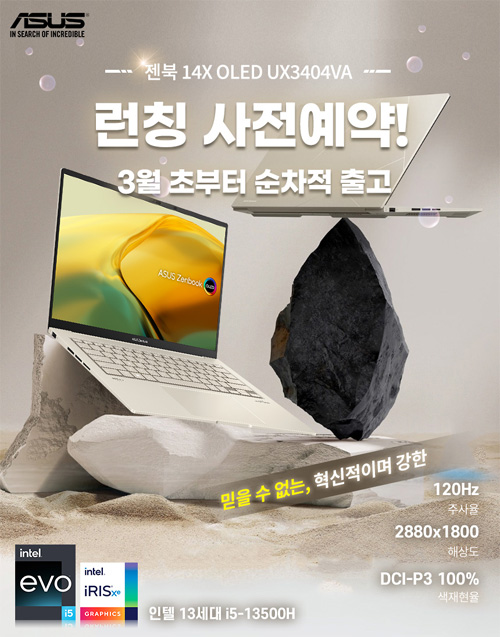 이번에 ASUS 최초로 출시된 인텔 13세대 UX3404VA-M9093 모델은 11번가와 G마켓 코리아에서 예약구매가 가능하며, 로지텍 M350 무선 마우스, 한컴2022, 어도브 3개월 무료이용권 등 다양한 사은품이 준비되어 있으며 오는 2월20일에 정식 런칭 되었다.