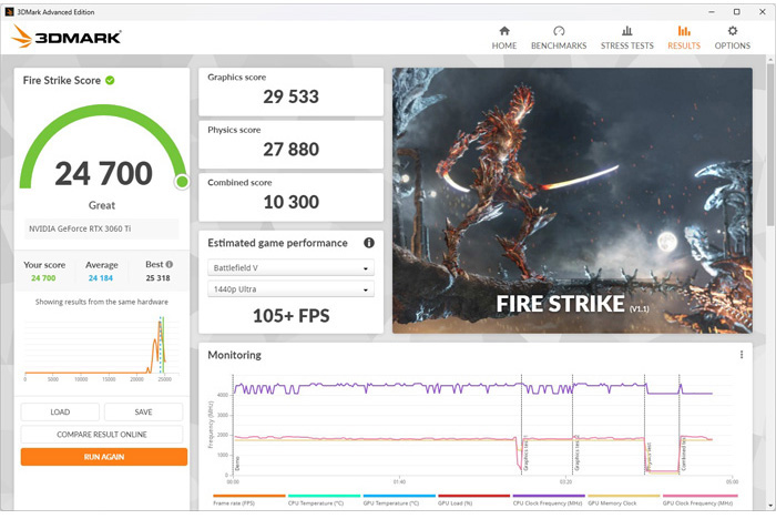 그렇다면 13세대 인텔코어 프로세서와 RTX 3060 Ti 탑재 PC가 어느정도 성능을 보여주는지 확인해 보도록 하자. 상단의 사진은 13400F + RTX 3060 Ti + 16GB DDR4 듀얼채널 메모리, 512GB NVMe SSD 로 조합된 게이밍 PC의 모습으로 3D 성능이 상당히 높은 것을 확인할 수 있다.