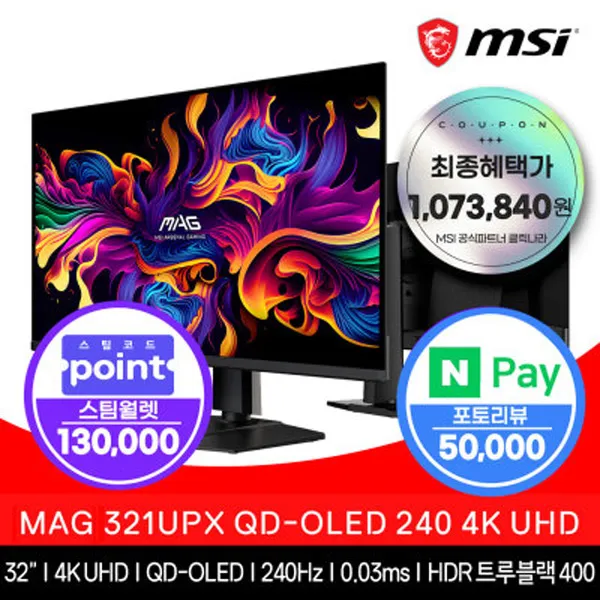 이번 행사를 통해, 동급 최고의 성능 및 가성비를 자랑하는 MSI 모니터 시리즈, 차세대 QD-OLED 디스플레이를 채용한 MSI QD-OLED 모니터 등 다양한 제품을 합리적인 가격에 만나볼 수 있다. 특히 32인치 QD-OLED 디스플레이, 4K UHD(3840*2160), 240hz 주사율 및 0.03ms GTG 응답속도 등 최강의 스펙을 자랑하는 ‘MSI MAG 321UPX QD-OLED’ 시리즈를 약 24% 할인 적용 및 최대 이벤트 혜택을 포함해 최종혜택가 107만 원대에 구매 가능하다.