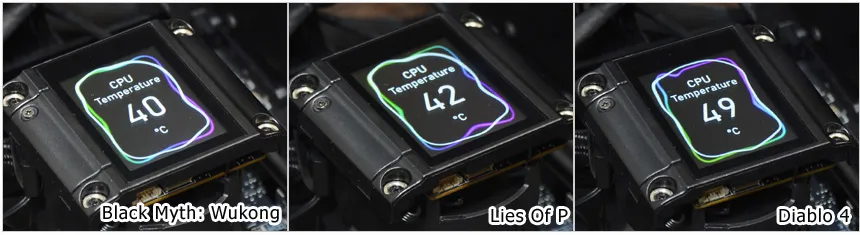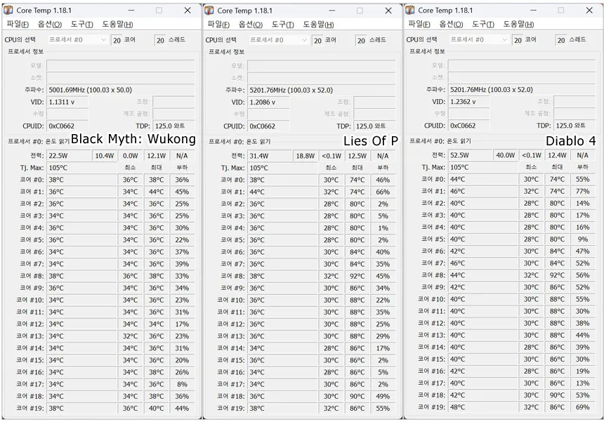 전력 효율성에 초점을 맞춘 모델로 가장 먼저 게임 실행시의 소비전력과 온도를 테스트 해 보았다. 3가지 게임을 테스트 했을 때 소비전력이 상당히 낮은 것을 확인할 수 있었으며 CPU의 온도도 14세대 이전의 프로세서와는 확연히 다른 것을 확인할 수 있었다. (참고로 실내 온도는 22도였다.) 4K 해상도 에서의 테스트 이며 해상도를 낮추었을 때 소비전력이 다소 올라가긴 했지만 큰 차이는 아니었다. 쿨러만 신경쓴다면 온도 걱정없이 PC를 사용할 수 있을 것이다.