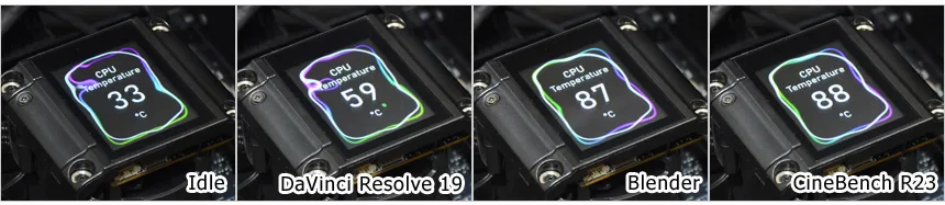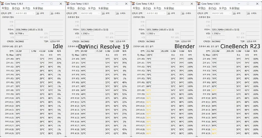 아이들 상태에서의 전력소비가 상당히 적은 것을 확인할 수 있었다. (온도는 30도 초반을 유지했다.) 또한 영상편집 프로그램인 다빈치 리졸브를 이용해 랜더링 테스트를 진행했을 때 100W 에 못미치는 소비전력으로 작동했으며 CPU 의존율의 높은 블랜더와 시네벤치 실행시에는 80도 이상으로 작동했지만 90도 이상으로는 올라가지 않는 것을 확인할 수 있었다. (쿨러 디스플레이 기준)