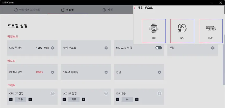 다양한 오버클럭 방법을 제공해 초보자도 손쉽게 성능을 높일 수 있다. 인텔 XTU에서 초보자도 손쉽게 오버클럭을 할 수 있도록 자동 오버클럭 기능을 제공하며 MSI Center와 같은 메인보드 S/W을 이용해 오버클럭을 할 수 있다. (전문가의 경우 CPU 수율에 맞게 바이오스에서 일일이 값을 설정하는 것을 추천한다.) @ 테스트는 MSI 센터의 게임 부스트를 활성화 하고 XMP를 적용한 상태에서 진행했다. 또한 메인보드의 전력제한은 해제했다.