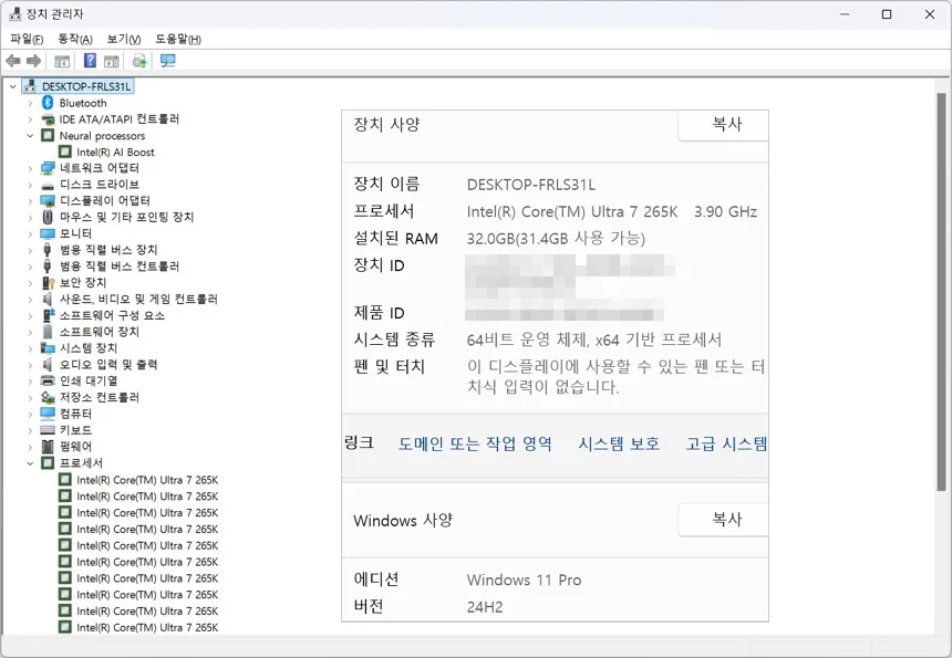 시스템 조립 후 윈도우를 설치하고 바이오스에 진입한 모습으로 CPU 가 정상적으로 인식되는 것을 확인할 수 있었다. (배수락이 해제된 CPU 답게 원터치 오버클럭 기술인 게임부스트를 활성화 할 수 있고 튜닝램을 사용해 XMP도 조정할 수 있다.) 또한 윈도우 11 설치후 장치관리자에 진입했을 때 정상적으로 CPU가 인식되는 것을 확인할 수 있었다.