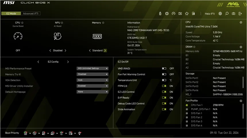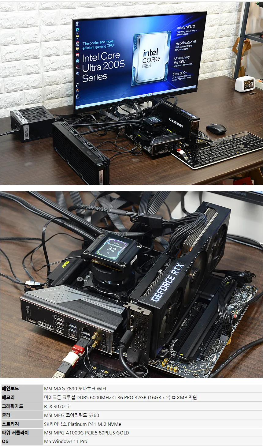 테스트를 위해 시스템을 구성한 모습으로 인텔코어 울트라 200S화 호환되는 MSI MAG Z890 토마호크 WIFI 메인보드를 사용했으며 (바이오스는 최신으로 업데이트 했다.) 메모리는 XMP를 지원하는 32GB 듀얼채널 튜닝램을 장착했다. 또한 RTX 3070 Ti 그래픽카드와 최상급 SSD인 SK하이닉스 P41을 장착했다.