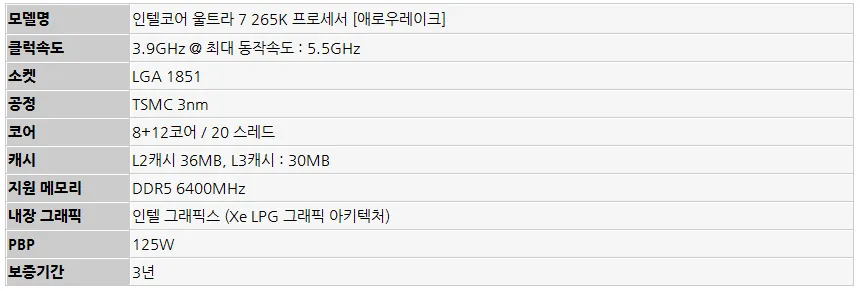 인텔코어 울트라 7 265K 프로세서는 전작인 14700K 와 같이 8개의 P코어와 12개의 E코어를 구성되어 있는 반면 하이퍼스레딩이 빠져 20스레드를 지원한다. 최대 동작속도는 0.1GHz 줄여 5.5GHz 지만 기본 클럭을 3.4GHz에서 3.9GHz 로 높여 멀티스레드 성능을 향상시켰다. 특히 두 개의 코어를 하나의 다이에 통합하여 워크로드의 우선순위를 정화고 분산하여 성능을 최적화 하는 새로운 코어 마이크로 아키텍처가 적용 되었다.