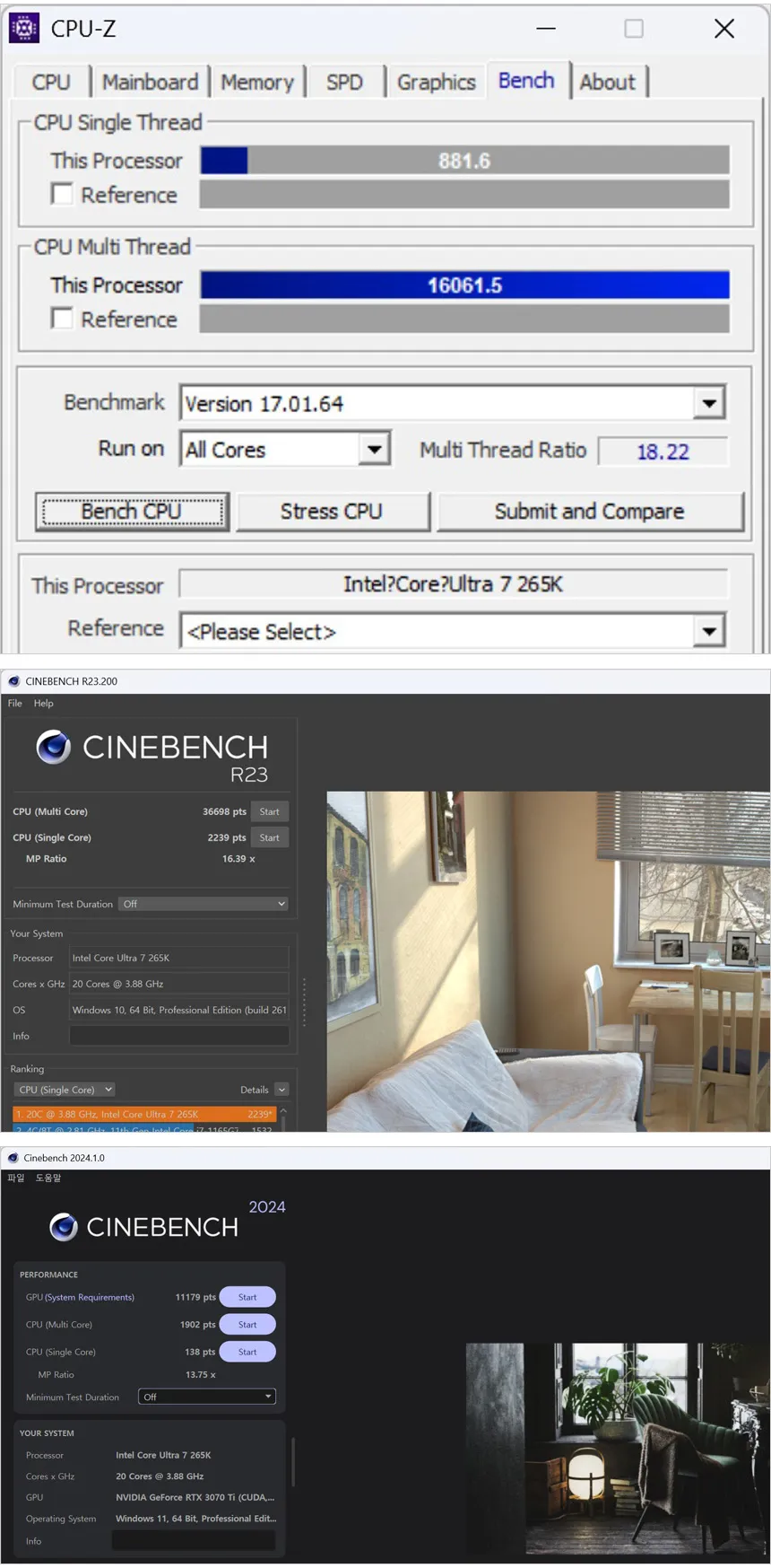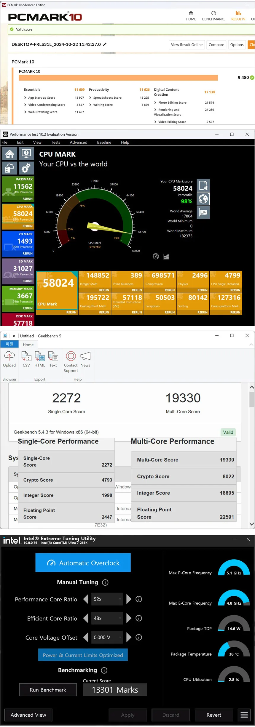 다양한 벤치마크 프로그램을 실행한 모습으로 퍼포먼스 테스트의 경우 스코어가 56465 (14700K) 에서 58024로 높아졌으며 인텔 XTU 벤치는 12027에서 13301 로 스코어가 높아졌다.