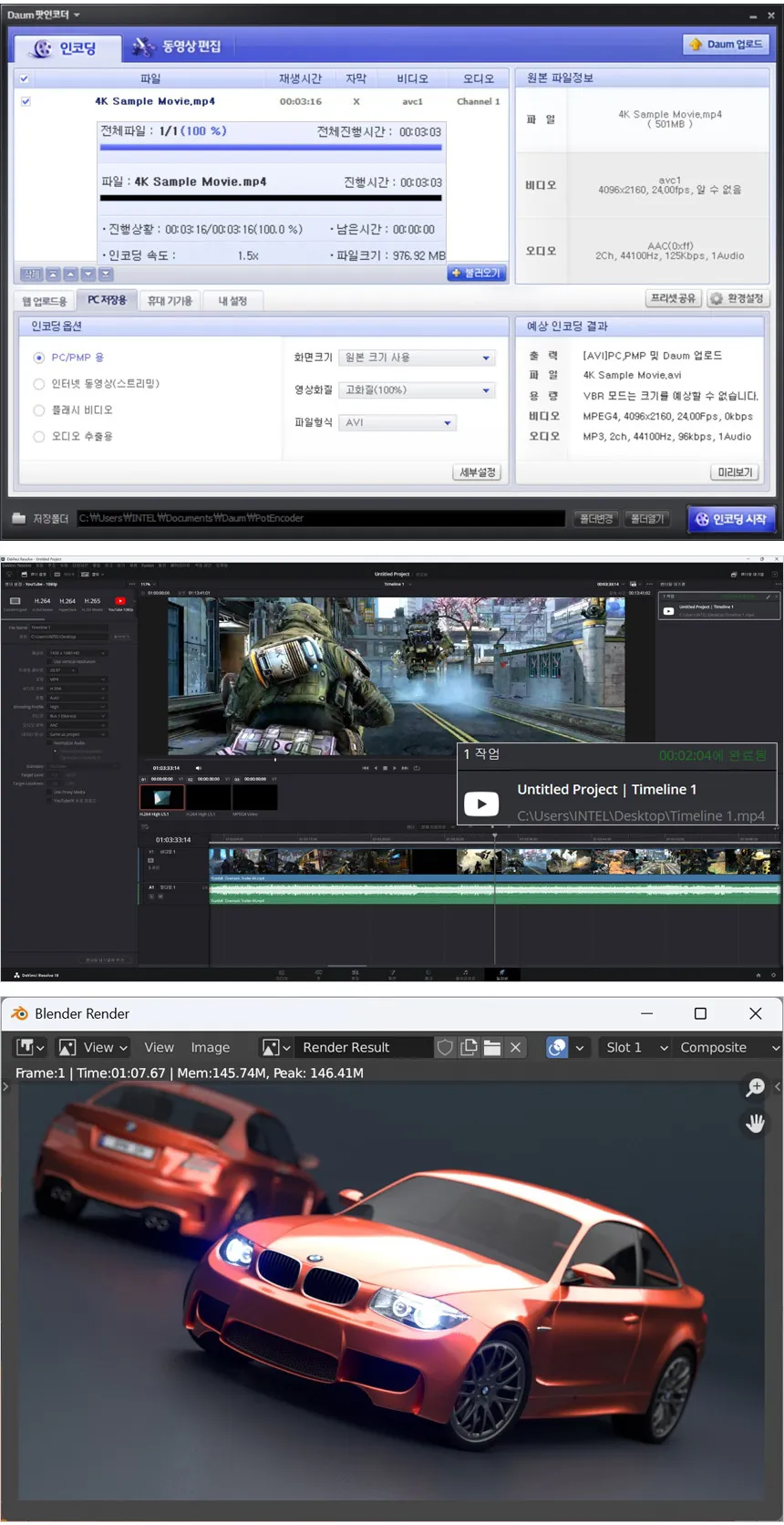 동영상 인코딩과 4K 랜더링 테스트를 진행하고 있는 모습으로 인코딩 시간은 3분 03초가 소요 되었고 영상편집 랜더링 시간은 (다빈치 리졸브를 사용했으며 640MB, 920MB, 990MB 4K 동영상을 단일 동영상으로 랜더링, FHD 해상도에 H.264 비디오 코덱) 2분 04초가 소요되었다. 또한 블랜더 랜더링 테스트에서는 1분 07초가 소요되는 것을 확인할 수 있었다. (14700K 대비 인코딩과 블랜더 랜더링 속도는 거의 비슷하며 다빈치 리졸브 속도는 18초 정도 빨랐다.) 전문작업자나 크리에이터가 사용하기에 충분한 높은 성능을 구현했다. 작업용 PC의 업그레이드가 필요할 경우 좋은 대안이 될 것이다.