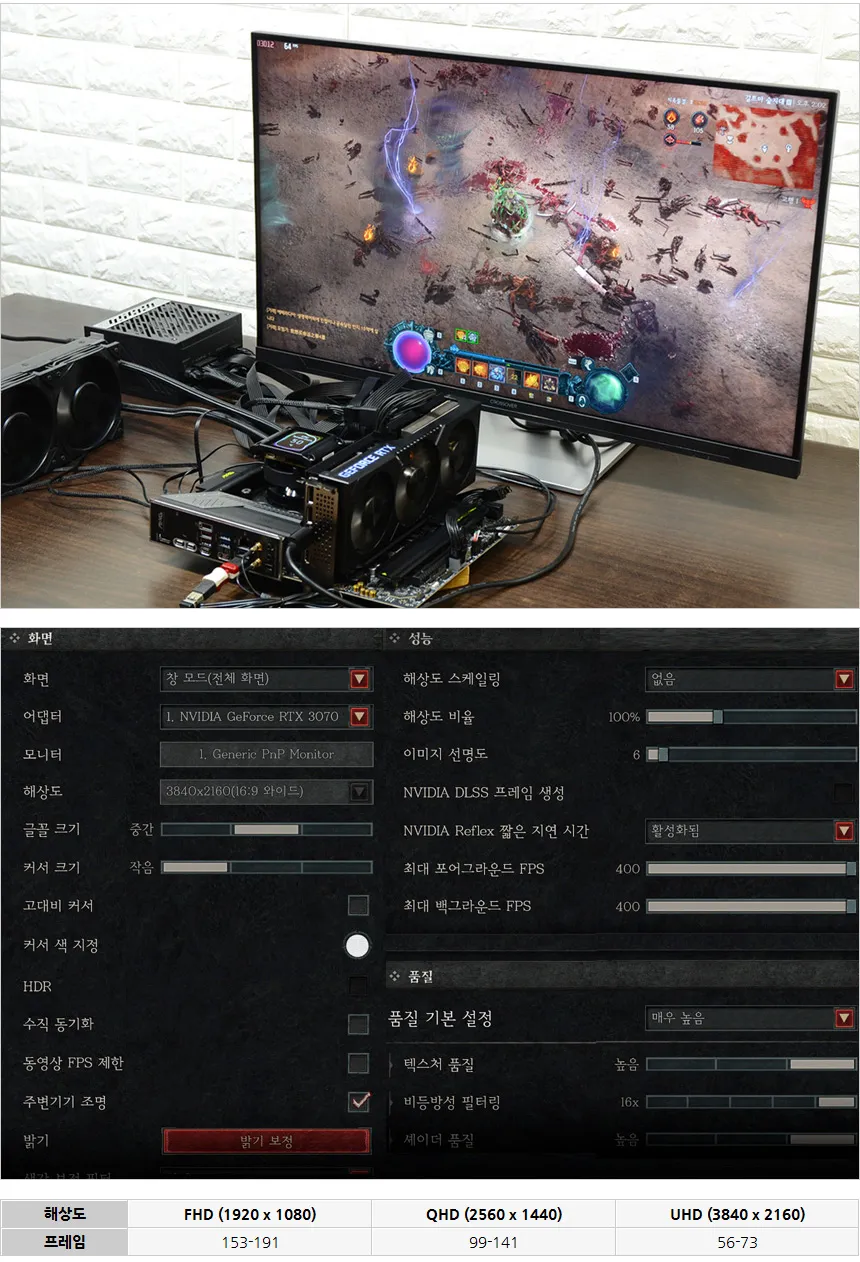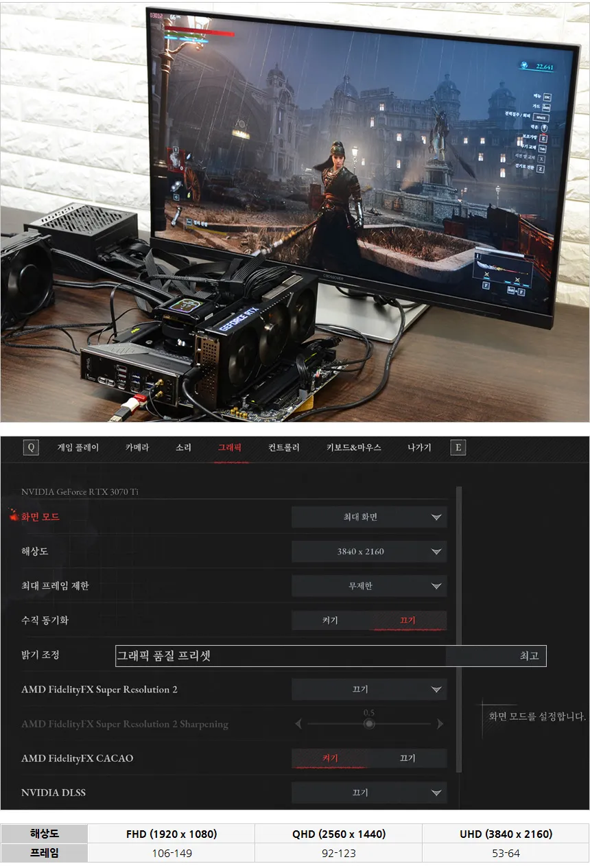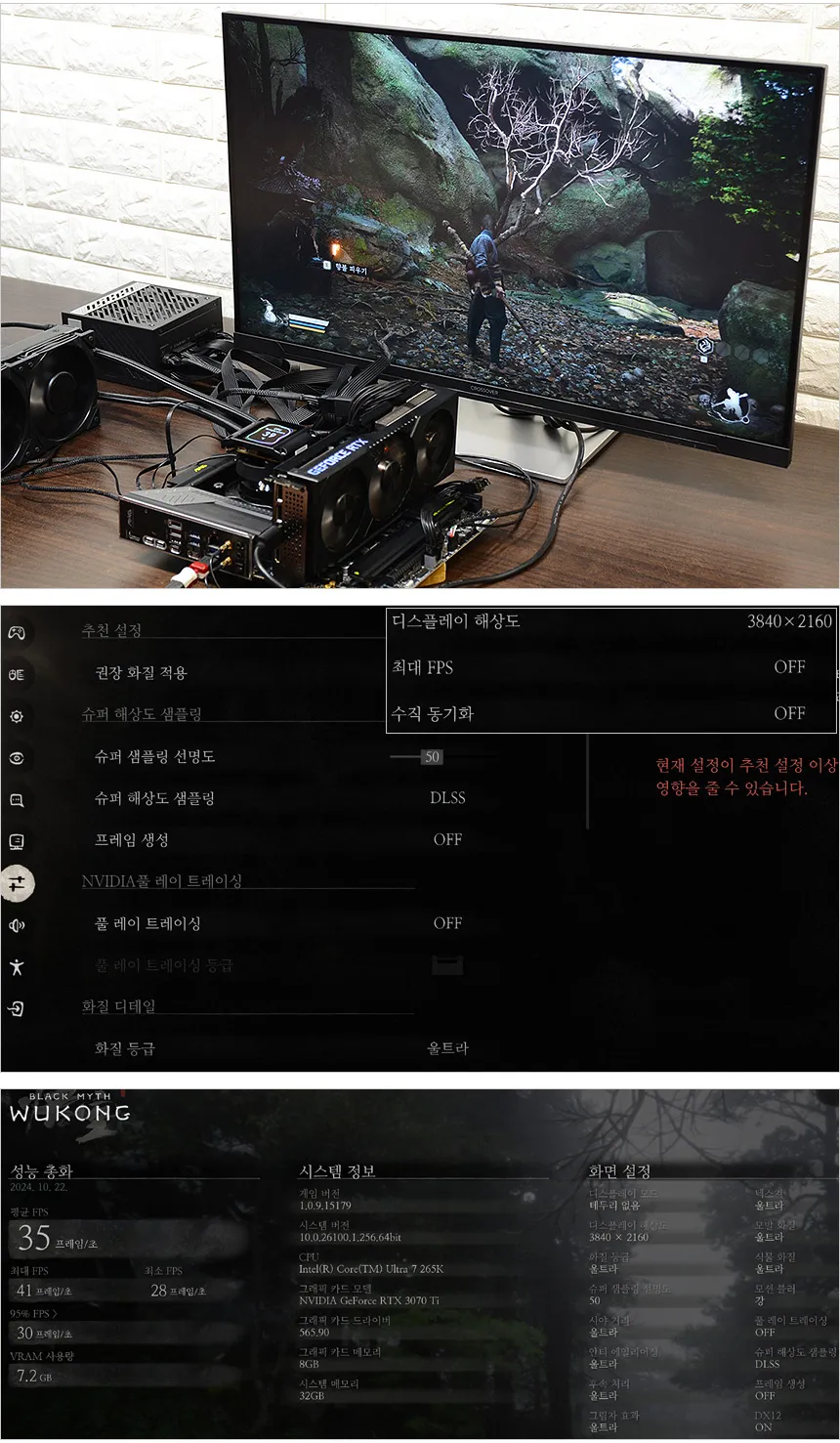 게임 테스트를 진행한 모습으로 검은신화 오공을 울트라 옵션에서 실행시 4K 기준 35 프레임을 보여 주었으며 해상도를 낮춰도 프레임의 큰 변화는 없었다. (5-7 프레임 정도 상승) 사용했던 RTX 3070 Ti 급의 그래픽카드를 사용할 경우 옵션을 낮추는 것을 추천하며 울트라 옵션에서 게임을 즐기고 싶다면 RTX 4070 이상의 그래픽카드 사용을 추천한다. @ DLSS 와 같은 스케일링 기술을 활용하면 중고급형 그래픽카드로도 게임을 부드럽게 즐길 수 있다.