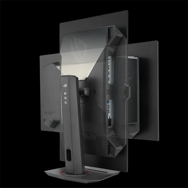 외적으로는 초슬림 프레임리스 디자인으로 넓은 느낌의 화면 시야를 제공하며, 후면에는 미래 지향적인 사이버펑크 디자인이 적용되어 강렬한 외형을 보여준다, 포인트로 RGB가 적용된 ROG 로고가 후면에 있어 자시 자신만의 모니터임을 강조할 수 있다. 스탠드에는 트랜드에 맞추어 컴팩트한 사이즈에 스마트폰을 거치할 수 있는 공간을 두어 작업 공간을 효율적으로 사용할 수 있다. 입력포트는 DisplayPort 1.4(DSC), HDMI 2.1x2, USB-C(DP Alt Mode, 90W PD), USB Hub(3xUSB 3.2 Gen 1 Type-A)를 갖추고 있으며, 스위블, 틸트, 피벗을 가지고 있어 자유롭게 시야각을 조절할 수 있다.
