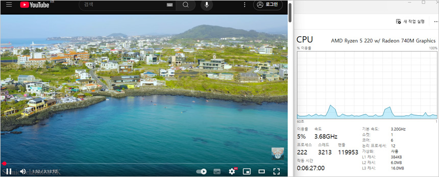 유튜브 고화질 동영상을 이용해 CPU 점유율을 테스트 하고 있는 모습으로 (2160P@60FPS) 5-11% 의 점유율을 보여 주었으며 인터넷과의 멀티테스킹 시에는 30% 중반까지 점유율이 올라가는 것을 확인할 수 있었다. (딜레이나 끊키는 등의 현상은 발생하지 않았다.)