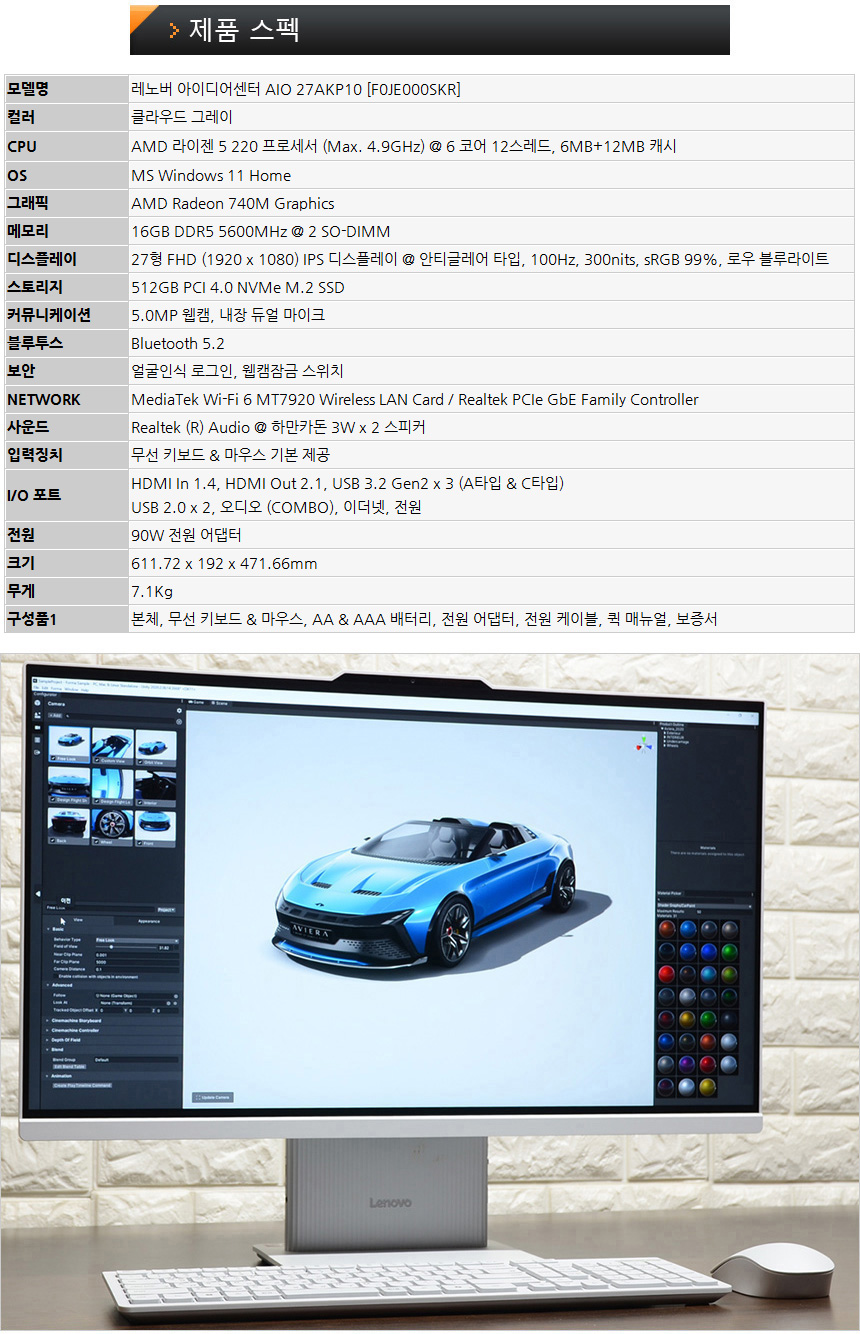 이번에 리뷰를 진행 할 레노버 아이디어센터 AIO 27AKP10 는 업무와 학습, 멀티미디어 등의 용도로 활용할 수 있는 올인원PC로 AMD 라이젠 5 220 프로세서 와 16GB 의 넉넉한 메모리 용량, 512GB NVMe M.2 SSD 탑재로 말씀드린 대부분의 작업들을 부드럽게 실행할 수 있다. 또한 27형 대화면 IPS 디스플레이를 지원해 밝고 선명한 영상을 즐길 수 있으며 하만카돈 듀얼 스피커가 장착되어 노트북과 같은 모바일 디바이스와는 확연히 다른 퀄리티 높은 사운드를 즐길 수 있다.