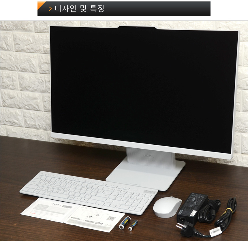 풀KIT 의 모습으로 본체를 비롯해 90W 전원 어댑터와 전원 케이블이 제공되며 퀵 매뉴얼, 보증서 등이 포함된 것을 확인할 수 있다. 또한 단품으로 판매되는 일반 데스크탑PC와 달리 무선 키보드와 마우스, USB 수신기, 배터리 등을 지원해 편의성을 높였다.