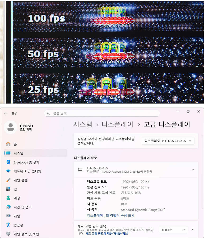 60Hz 주사율을 지원하는 보급형 올인원PC와 달리 100Hz 주사율을 지원해 부드러운 영상의 움직임을 경험할 수 있다. (눈의 피로감도 상당히 줄어든다.) 상단의 사진은 100Hz 의 높은 주사율을 쉽게 확인할 수 있도록 하위 프레임과 같이 재생되는 영상 (960 Pixel Per Sec) 을 셔터스피드 1/20 로 촬영한 모습으로 프레임이 낮을수록 캐릭터의 수가 적으며 프레임이 높아질수록 시간당 많은 화면이 뿌려지기 때문에 캐릭터의 수가 많은 것을 확인할 수 있다.