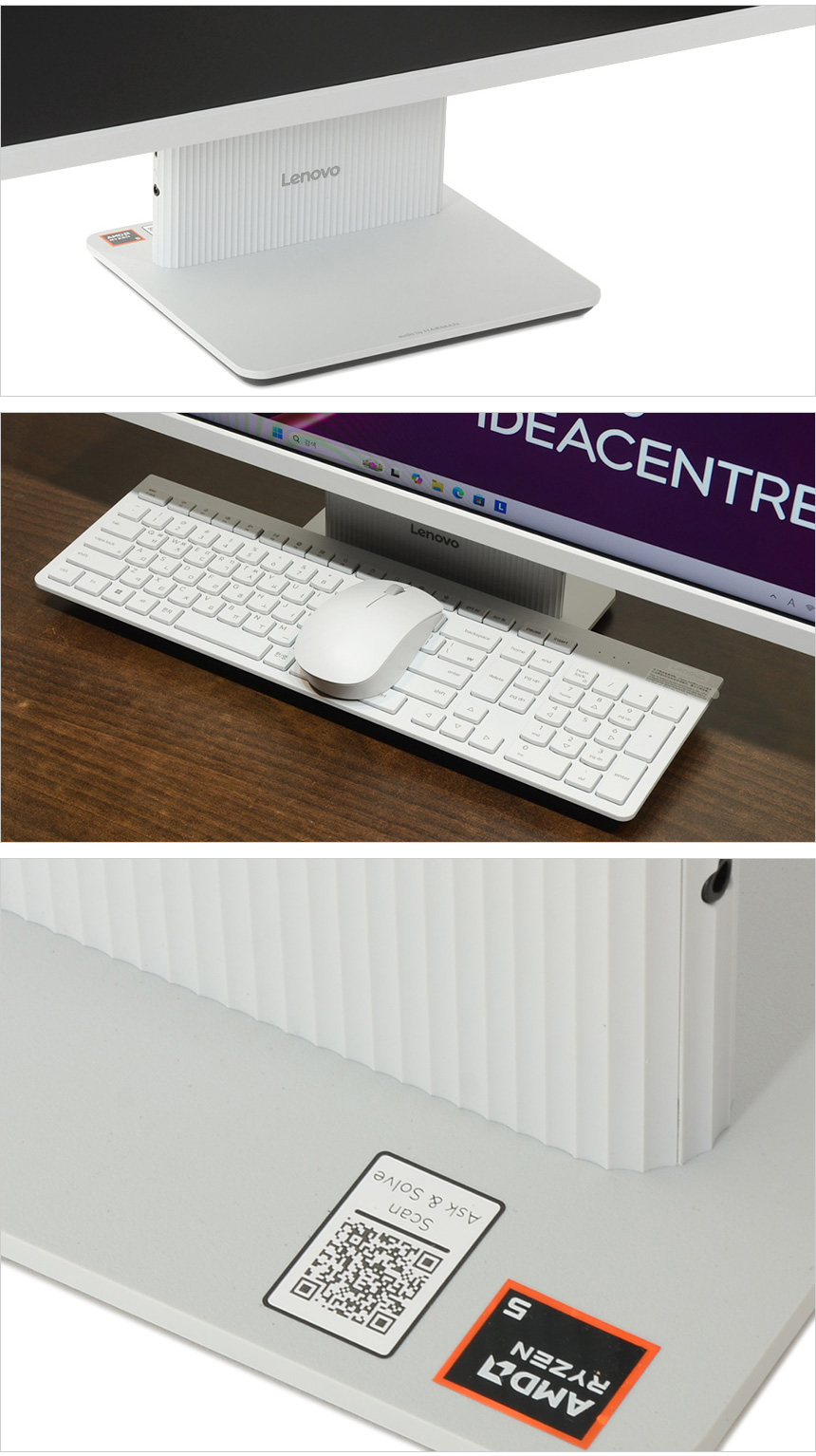 하단부의 모습으로 받침대의 공간이 넉넉해 PC를 사용하지 않을 경우 사진과 같이 키보드와 마우스를 올려두어 책상을 더 깔끔하게 관리할 수 있으며 스마트폰이나 주변기기를 놓아두는 공간으로 활용할 수 있다. 또한 받침대에 부착된 QR코드를 스마트폰으로 스캔하면 생산일자 확인이 가능하며 드라이버 등을 다운로드 받을 수 있다.