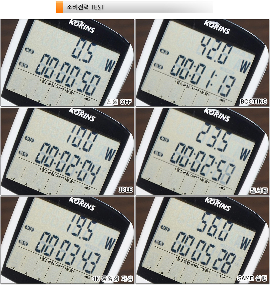 소비전력 테스트를 진행하고 있는 모습으로 캐주얼한 작업시에는 30W 이하로 작동했으며 최고 성능으로 동작하는 게임 실행시에는 56W 까지 소비전력이 올라가는 것을 확인할 수 있었다. (전기세 걱정없이 사용할 수 있는 모델이다.)