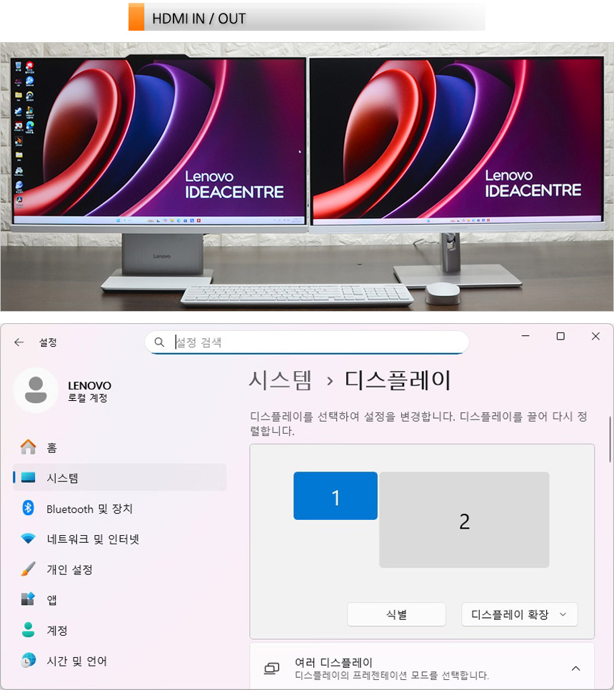 HDMI IN 단자 지원으로 노트북이나 기타 디바이스를 연결해 모니터 용도로 활용할 수 있다. (별도의 HDMI 변환 스위치는 제공하지 않고 HDMI IN 연결이 되면 자동으로 올인원PC가 모니터로 작동한다.)