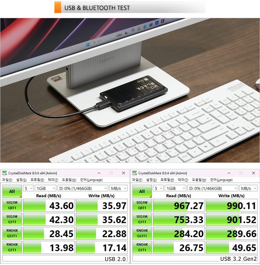 USB 3.2 Gen2 단자를 지원해 빠른 데이터 전송이 가능하다. 상단의 사진은 외장 SSD를 이용해 속도 테스트를 진행하고 있는 모습으로 USB 2.0 과 확연한 차이를 보여주었다.