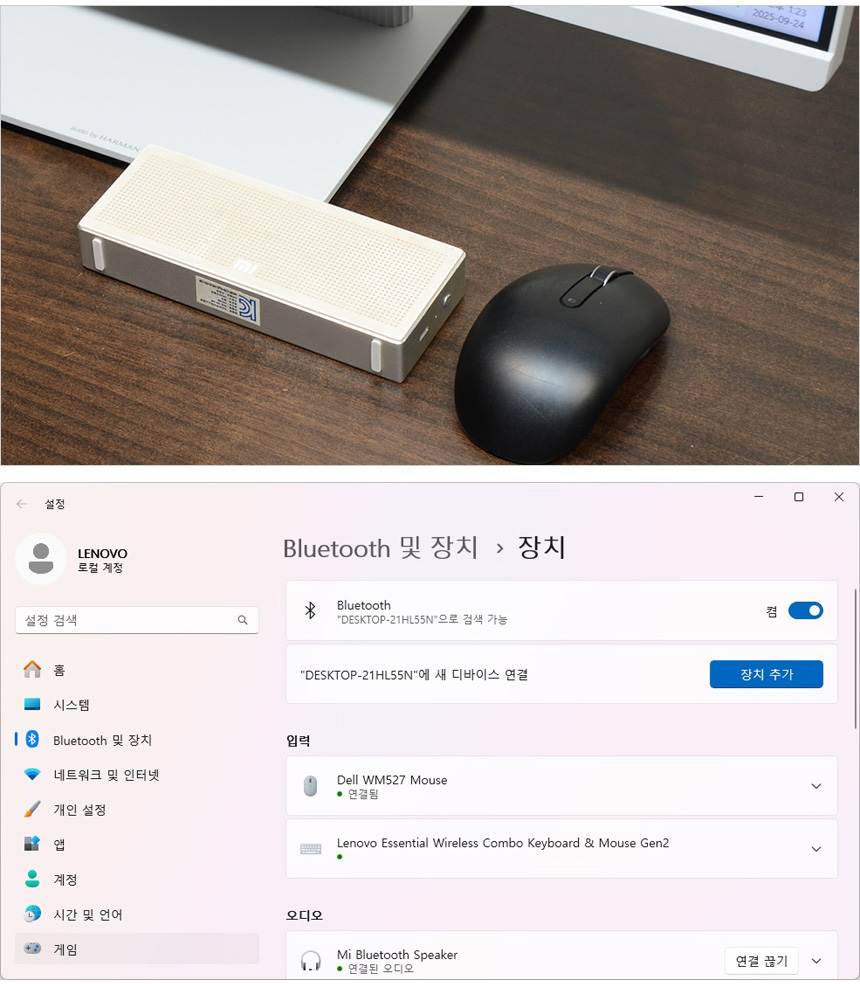 블루투스를 지원해 주변기기를 무선으로 연결해 활용할 수 있다. 상단의 사진은 페어링 테스트를 진행하고 있는 모습으로 마우스와 스피커가 완벽하게 연결되는 것을 확인할 수 있었다.