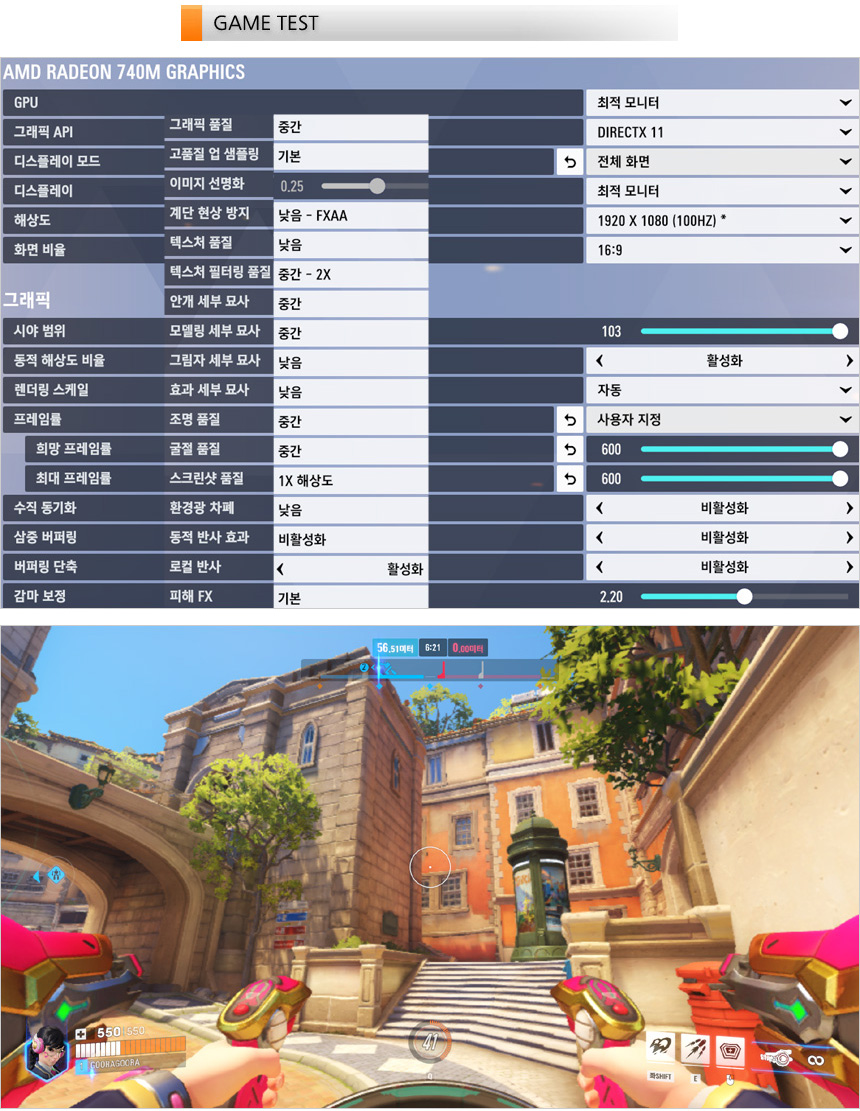 오버워치2를 이용해 프레임 테스트를 진행하고 있는 모습으로 중간 옵션에서 93-117 프레임을 보여주었다. 특히 100Hz 주사율을 지원해 캐릭터의 움직임이 상당히 부드러운 것을 확인할 수 있었다. (동영상을 통해 자세히 확인하기 바란다.)