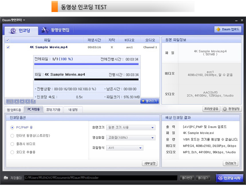 다음 팟인코더를 이용해 4K 동영상의 인코딩을 진행하고 있는 3분 34초의 빠른 인코딩 시간을 보여주었다.