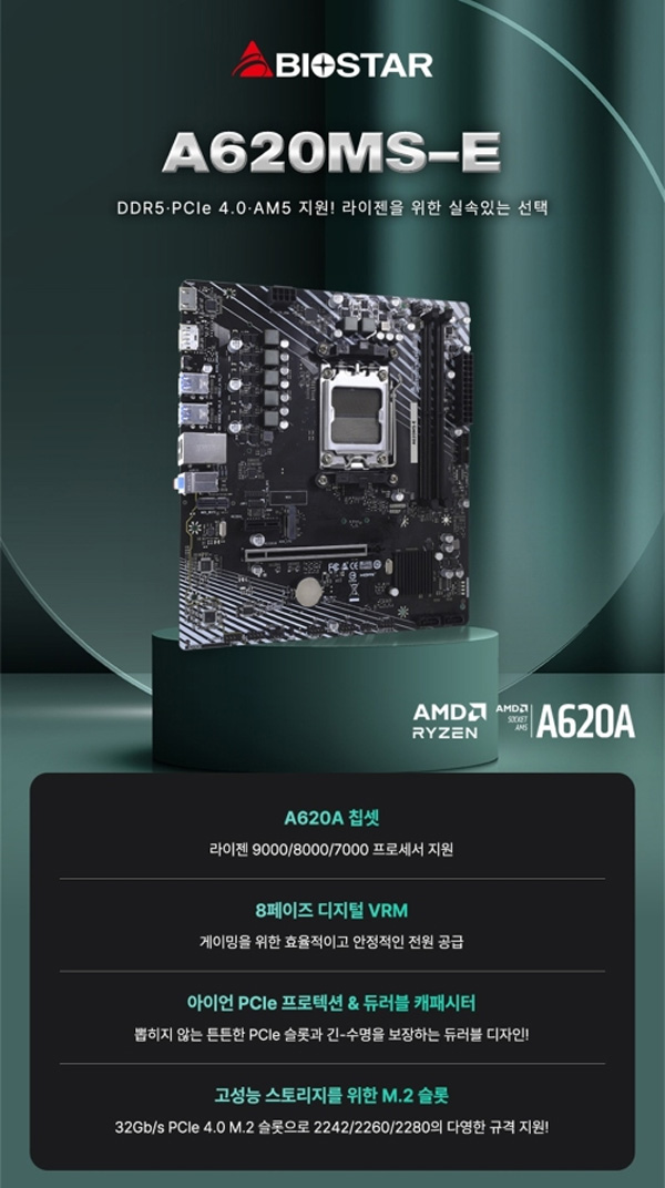 새롭게 선보이는 A620MS-E 메인보드는 라이젠 7, 8, 9000 프로세서를 모두 지원하며 8 페이즈의 디지털 VRM을 통해 최신 라이젠 프로세스도 장착 가능한 전원부를 탑재 하였으며, DDR5 메모리 최대 8000 (OC)MHz 클럭을 지원하여 합리적인 가격에 높은 성능을 경험하고자 하는 사용자들에게 적합한 제품이다.