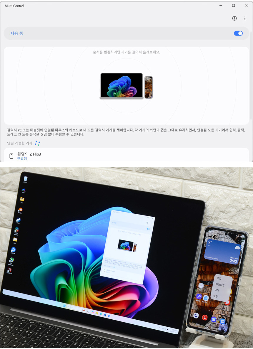 노트북 키보드와 연결된 마우스를 스마트폰에서도 사용할 수 있는 멀티 컨트롤 기능을 제공한다. 상단의 사진은 멀티 컨트롤을 테스트 하고 있는 모습으로 듀얼 모니터를 사용한 듯 자연스럽게 마우스 커서가 이동하는 것을 확인할 수 있었다. (KVM 과 달리 디바이스 변경을 위한 단축키도 누를 필요가 없다.) 텍스트 등을 복사에 기기간 붙여넣기도 할 수 있어 유용하게 활용할 수 있을 것이다. @ 동영상을 확인하기 바란다.