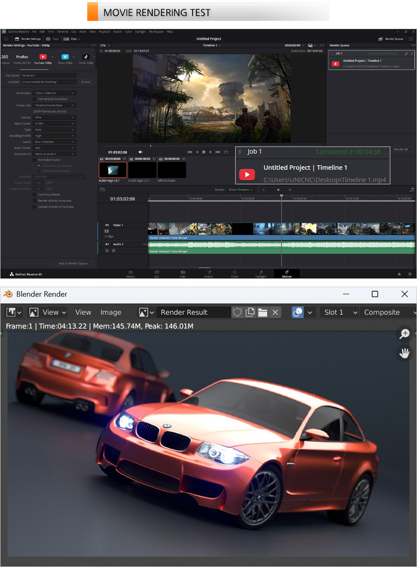 영상편집 S/W 다빈치 리졸브를 이용해 랜더링 테스트를 진행하고 있는 모습으로 (640MB, 920MB, 990MB 4K 동영상을 단일 동영상으로 랜더링, FHD 해상도에 H.264 비디오 코덱) 4분 38초가 소요되는 것을 확인할 수 있었으며 블랜더 랜더링 테스트에서는 4분대의 빠른 랜더링 시간을 보여주었다. @ 크리에이터 노트북으로 사용하기에 부족함이 없을만큼 랜더링 시간이 짧은 것을 확인할 수 있다.