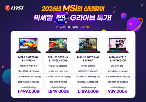 이번 라이브 방송을 통해 ▲소드 GF76 HX B14WFK-i9 ▲소드 GF76 HX B14WGK-i9 QHD ▲소드GF76 A AI B8VF-R7 ▲사이보그 15 B2RWEKG-C5 등 총 4종의 인기 게이밍 노트북을 선보인다. 소드 GF76 HX 2종은 인텔 코어 i9 프로세서와 RTX 50 시리즈 그래픽을 기반으로 대화면에서 안정적인 고성능 게이밍 환경을 제공하며, 베스트셀러 모델인 소드 GF76 A AI는 AMD 라이젠 7 프로세서를 통해 성능과 실용성의 균형을 강화했다. 대학생에게 인기 높은 사이보그 15는 가볍고 세련된 디자인에 RTX 그래픽을 더해 합리적인 가격대의 게이밍 노트북으로 제시된다.