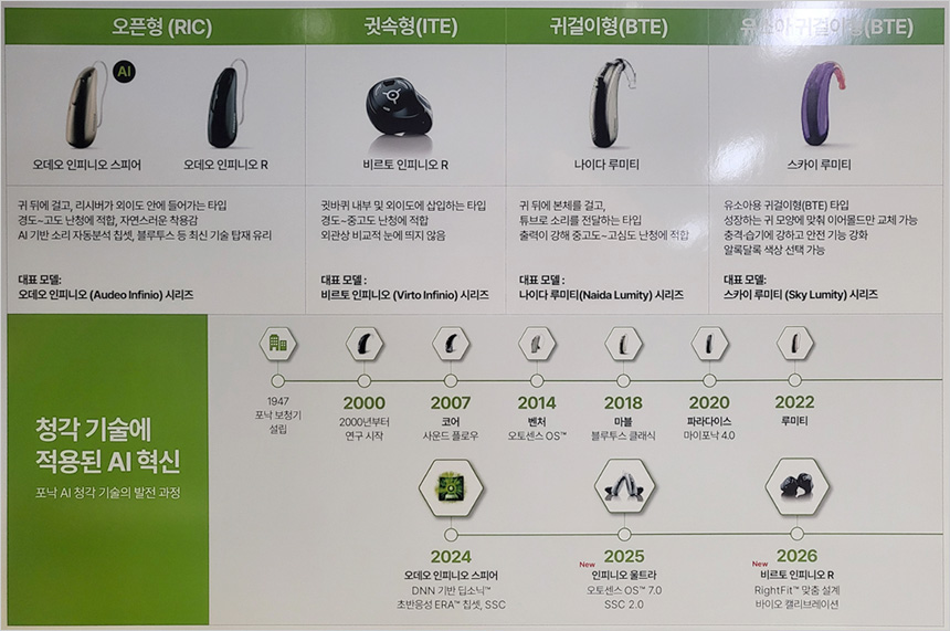 포낙이 제시한 인피니오 울트라 플랫폼은 청취 환경을 실시간 분석하고 자동으로 소리를 최적화 하는 AI 기반 구조로 설계됐다. 오토센스 OS 7.0은 다양한 소리 환경 데이터를 학습해 사용자의 조작 없이 상황에 맞는 설정을 자동 적용하며 딥러닝 기반 음성분리 기술인 스피릭 스피치 클래리티 2.0 은 복잡한 소음 환경에서도 말소리를 정교게 추철, 강화하도록 고도화 했다.