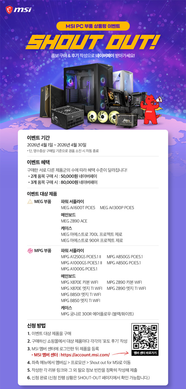먼저 4월 30일(목)까지 진행되는 ‘ShoutOutfor MSI’는 MSI의 인기 메인보드, PC 케이스, 파워 서플라이를 구매하고 사용기를 작성한 고객에게 네이버 페이를 증정한다. 특히 서로 다른 제품군을 2개 구매 시 5만 원, 3개 구매 시 최대 8만 원의 혜택을 받을 수 있어 합리적인 구매가 가능하다.