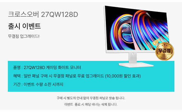 크로스오버존은 27QW128D iPS QHD 게이밍 화이트 출시를 기념하기 위해 이벤트를 진행한다. 4월 27일 월요일부터 소진시까지 모든 인터넷 몰을 대상으로 진행되는 이번 행사는 일반 모델을 구입하면 무결점 모델로 무료 업그레이드 후 출고해 1만원 상당의 할인 효과를 맛볼 수 있다.