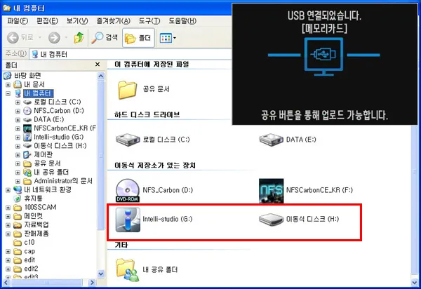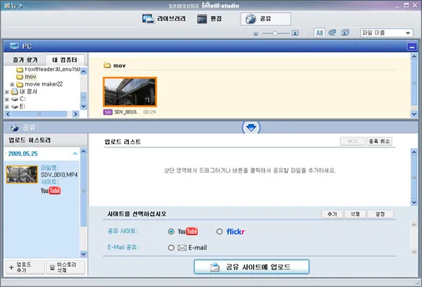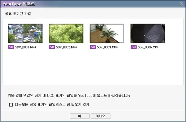 기기 측면에 부착된 공유 버튼을 이용하여 업로드 하고자 하는 동영상을 선택할 수 있다. 선택후 USB 케이블로 기기와 PC가 연결된 상태에서 기기의 공유 버튼을 누르게 되면 상단의 사진과 같이 선택된 동영상을 한번에 업로드 할 수 있다.