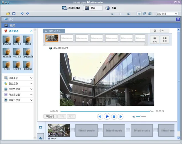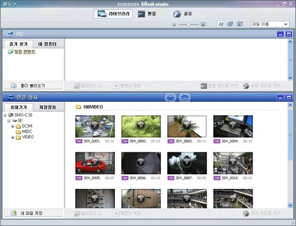 얼마전 리뷰를 진행했던 H106과 마찬가지로 '빌트인 S/W' 방식을 적용하고 있다. USB 케이블을 이용하여 기기와 PC를 연결하면 이동식 디스크만 인식되는 일반 제품들과 달리 Intelli-Studio 라는 별도의 드라이브가 생성되며 자동으로 프로그램이 실행된다. 상단의 사진과 같이 촬영된 영상을 관리할 수 있는 라이브러리 메뉴 및 동영상 편집, 공유 메뉴로 구성된 것을 확인할 수 있다. @ 일일이 인스톨 해야하는 다른 프로그램들과 달리 다이렉트로 프로그램을 사용할 수 있어 언제 어디서나 PC만 있다면 촬영된 영상을 편집하고 동영상 사이트에 업로드 할 수 있다.