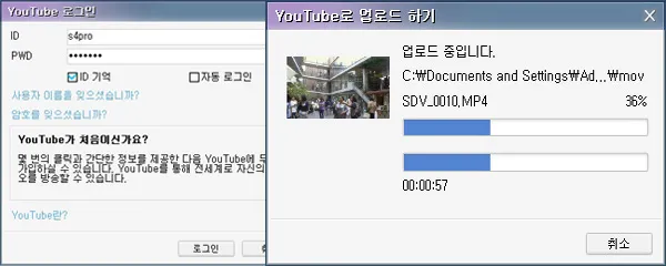 마지막으로 UCC 업로드 기능을 확인해 보도록 하자. 공유 아이콘을 누르면 상단의 사진과 같이 동영상 업로드 화면이 표시된다. 업로드 할 동영상을 지정하고 공유 사이트를 선택한 후 (YouTube 및 Flickr 사이트를 지원하고 있다. 필자는 YouTube로 테스트를 진행했다.) 업로드 버튼을 누르면 로그인 창이 뜨며 로그인을 완료하면 파일을 업로드 하게 된다.