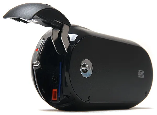 기기 후면부의 모습으로 덜렁덜렁 거리는 캡을 사용하는 일반 제품들과 달리 상단에 고정되는 슬라이딩 캡을 적용한 것을 확인할 수 있다. (작은 부분이라 할 수 있지만 개인적으로 무척 만족스러웠다.) 충전표시 LED 및 레코딩 버튼이 부착되어 있고 내부에는 배터리 및 메모리 슬롯, 전원 단자, AV단자도 설치된 것을 알 수 있다. @ 16GB를 지원하는 C14와 달리 C1의 경우 내장메모리를 지원하지 않는다. 하지만 최대 32GB의 SDHC 지원하여 고화질 동영상을 저장하는데 불편은 없으리라 생각한다.