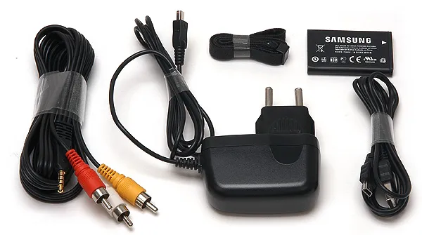 FULL KIT 의 모습으로 다양한 액세서리가 기본 제공되는 것을 확인할 수 있다. 본체를 비롯하여 전원어뎁터, 배터리, 핸드스트랩, USB 케이블, AV 케이블이 포함되어 있으며 사진에는 보이지 않지만 퀵메뉴얼 및 사용설명서 CD도 제공된다. (또한 빌트인 S/W를 지원하는 제품으로 USB 연결 후 Intelli Studio 프로그램을 사용할 수 있다.)