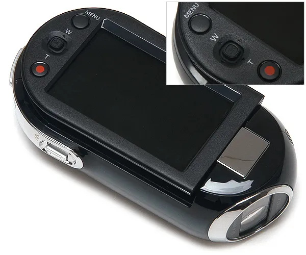 23만 화소를 지원하는 2.7인치 TFT LCD가 장착되어 있다. (LCD 보정 기능을 지원하여 밝은 태양 아래서도 불편없이 촬영 상황을 확인할 수 있다.) 고급형 제품들과 달리 터치스크린은 지원되지 않지만 사진과 같이 측면에 조그 버튼이 부착되어 있어 기능을 선택하거나 촬영된 동영상을 재생하는데 불편함은 없다. (하단에서 자세히 설명드리겟지만 C10 의 UI 인터페이스는 무척이나 심플하다. 굳이 터치스크린을 지원하지 않는다 하더라도 간편하게 기기를 조작할 수 있다.) @ Menu 버튼 및 레코딩 버튼도 부착된 것을 알 수 있다. 조그 버튼의 경우 일반적인 메뉴이동 및 선택은 물론 촬영시 줌 기능도 지원하고 있다.