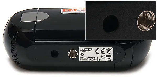 기기 바닥면의 모습으로 삼각대 연결을 위한 마운트 홀이 설치된 것을 알 수 있다. (캠코더 전용 삼각대 연결도 가능하도록 2개의 홀이 제공되는 것을 확인할 수 있다.)