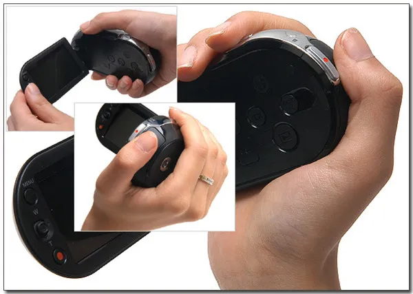 손목부담을 줄인 인체공학적인 설계가 돋보이는 제품으로 (상단의 사진과 같이 손목이 꺽이는 일반 슈팅형 제품들과 달리 손목의 꺽임 없이도 완벽하게 앵글을 설정하고 촬영을 진행할 수 있다. 장시간 동영상을 촬영하는 유저들은 더 이상 손목의 피로를 호소하지 않아도 될 듯 하다.) 크기가 작아서 그런지 그립감도 상당히 만족스러웠다. (R10 의 경우 손에 쥐었을 때 약간 부담이 되던 것과 달리 C10 은 손에 감기는 맛이 참 좋다.)