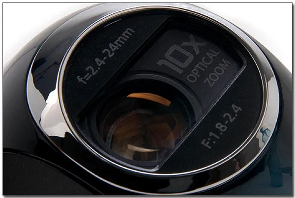기기 전면부의 모습으로 10배 광학 줌을 지원하는 (1200배 디지털 줌 지원) 삼성 렌즈가 장착된 것을 확인할 수 있다. (대부분의 제품들과 달리 스크래치 방지 렌즈가 전면에 설치되어 렌즈캡을 장착하지 않더라도 내부의 렌즈가 오염되거나 손상될 위험이 없다. 촬영 할 때 마다 일일이 렌즈캡을 분리해야 하는 불편함이 전혀 없다.) 또한 하단에는 2개의 내장 마이크가 장착되어 음성을 보다 또렷하게 녹음할 수 있다.