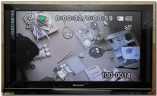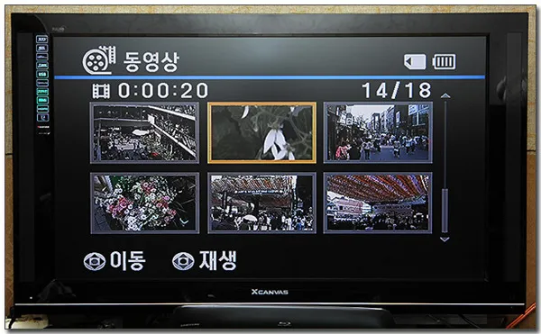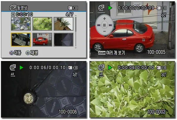 촬영한 동영상은 기기 측면에 부착된 재생 버튼을 이용하여 간편하게 감상할 수 있다. (상단의 사진은 동영상을 재생하고 있는 모습으로 총6개의 썸네일이 표시될 뿐만 아니라 섬네일에서도 동영상이 재생되어 원하는 파일을 보다 쉽고 편리하게 선택할 수 있다.) @ 조그버튼을 통해 볼륨 및 재생관련 설정을 손쉽게 실행할 수 있었다.