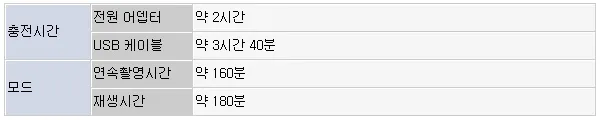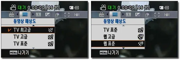총 5가지의 해상도를 지원하는 것을 알 수 있다. TV 해상도의 경우 최고급, 고급, 표준 모두 720 x 480@60i 를 지원하며 웹 해상도의 경우 640 x 480@30p를 지원한다. 화질에 따라 다양하게 해상도를 선택하여 사용할 수 있는 제품이다. (화질이 좋을수록 저장된 동영상 파일의 크기는 커지게 된다. 자신의 메모리 용량이나 라이프 스타일에 따라 선택하여 사용하면 될 듯 하다.)