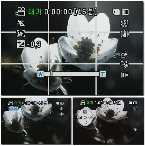 대기 화면의 모습으로 다양한 정보가 표시되는 것을 확인할 수 있다. (양 측면에 기본 지원하는 다양한 기능의 아이콘이 표시되며 상단에는 촬영 시간 및 배터리 상태가 표시되는 것을 알 수 있다.) 또한 촬영 정보 표시 여부를 선택할 수 있으며 대부분의 기능이 자동으로 최적화 되는 EASY.Q 기능을 지원하여 초보자도 간편하게 동영상을 촬영 할 수 있다. 뿐만 아니라 단축버튼을 지원하여 노출, iSENCE, 재생 등 자주 사용하는 기능을 보다 빠르게 실행할 수 있다. (조그 버튼을 누르면 하단 우측의 사진과 같이 단축버튼이 LCD에 표시된다.)
