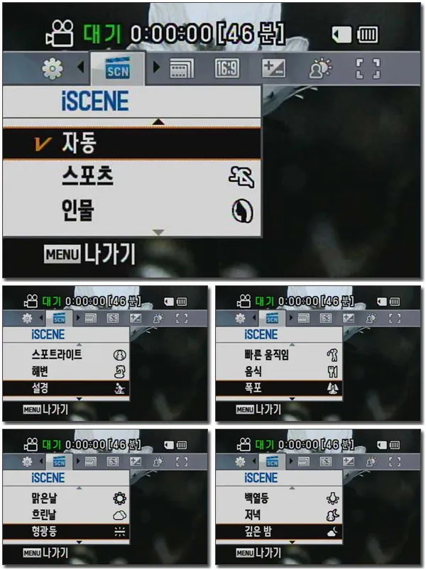 촬영의 대상이나 주변환경에 따라 최적의 노출값을 지정해 주는 iSENCE 메뉴를 지원하고 있다. (일반적인 장면모드 뿐만 아니라 화이트밸런스 관련 모드도 동시에 지원하는 것을 확인할 수 있다. 선택의 폭이 무척 다양하여 어떠한 환경에서도 만족스런 동영상을 촬영할 수 있으리라 생각한다.)