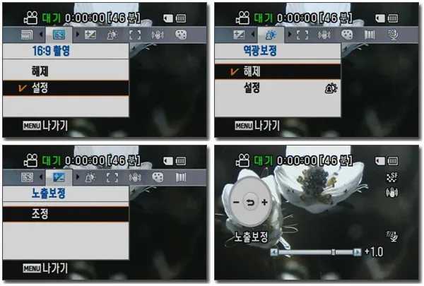 필자와 같이 16 : 9 해상도를 지원하는 HDTV를 사용하는 유저들이 있는 반면 4:3 비율의 아날로그 TV를 사용하는 유저도 많으리라 생각한다. C10 은 16:9 촬영 설정을 지원하여 TV의 종류에 따라 원하는 화면비율을 선택하여 외부 영상기기에서 감상할 수 있다. (쉽게 말해 짤리는 부분없이 꽉찬 영상을 TV로 즐길 수 있게 해 주는 설정이다.) 또한 역광보정 기능을 지원하여 역광으로 인해 어두워 지는 피사체를 밝고 선명하게 촬영할 수 있으며 사진과 같이 수동 노출보정 기능도 지원하는 것을 확인할 수 있다.