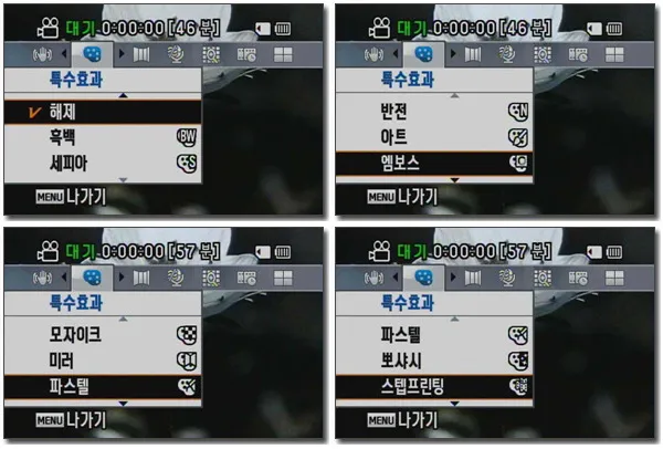 재미있고 독특한 영상을 촬영할 수 있는 특수효과 기능의 모습으로 다양한 메뉴를 지원하여 재미있게 기기를 활용할 수 있다.